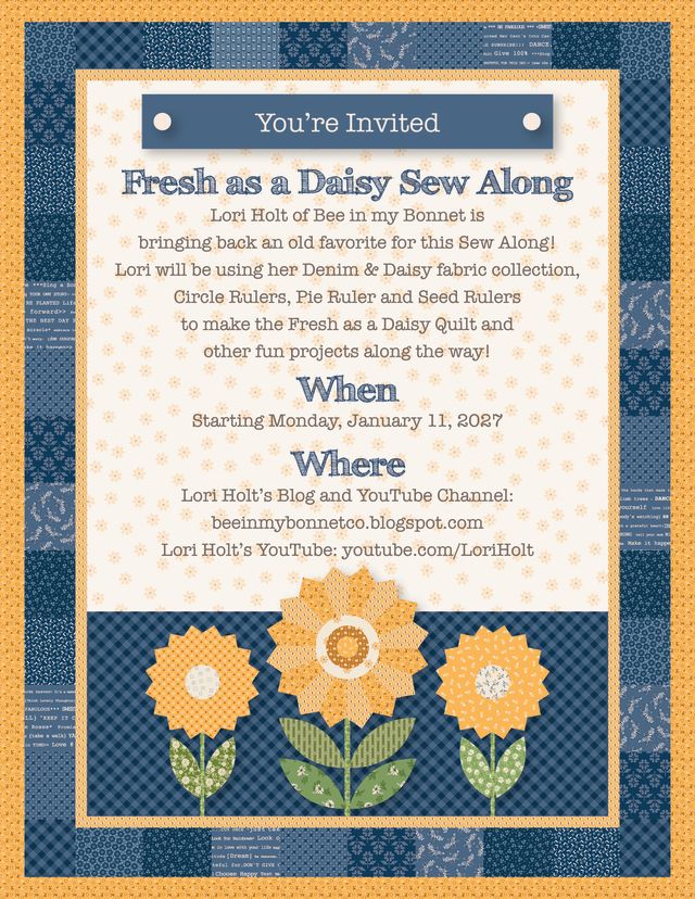 The Fresh as a Daisy Sew Along Quilt Kit includes fabric for quilt top and binding. Backing not included (suggested backing is 2 1/2 yards of WB18151-DAISY). Circle Rulers, Seed Rulers, and Pie Ruler are sold separately. The Sew Along Guide will be available on Riley Blake Designs' website in December 2026. Kit comes in a keepsake box.