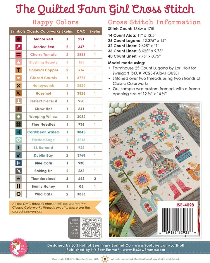 The Quilted Farm Girl Cross Stitch Pattern comes with full-color instructions, diagrams and supply list, including suggested Classic Coloroworks and DMC floss. It is printed on durable 8.5" x 11" cardstock. The cross stitch is designed to work on 25 count Lugana and finishes at 12.375" x 14".